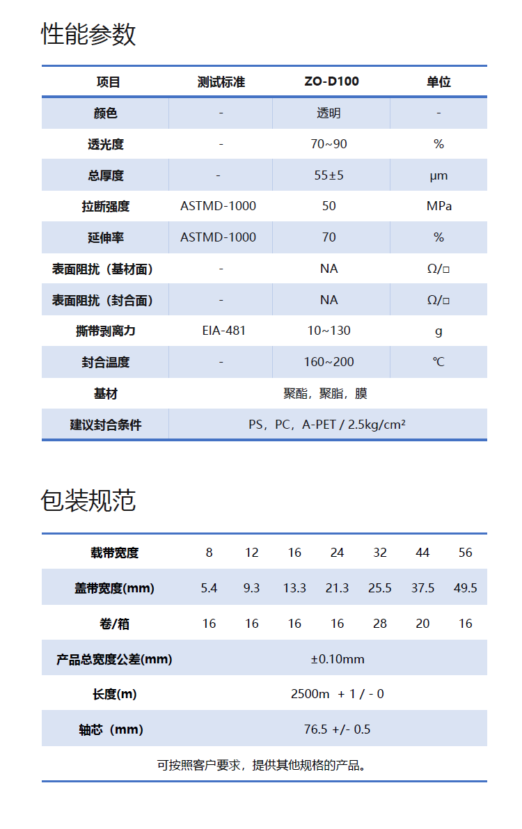ZO-D100蓋帶是指在一種應用于電子包裝領域的帶狀產品,與載帶配合使用,可在外力或加熱的情況下封合在載帶的表面,形成閉合的空間,保護載帶口袋中電子元器件。
